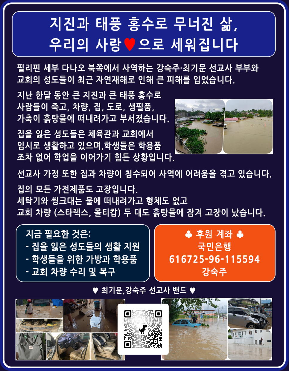 선교사 가정 또한 집과 차량이 침수되어 사역에 어려움을 겪고 있습니다.